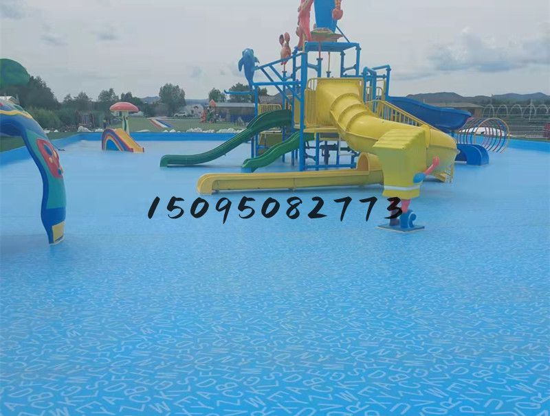 本項(xiàng)目位于內(nèi)蒙古自治區(qū),為室外新建混凝土水上樂園項(xiàng)目,基礎(chǔ)面水泥砂漿找平處理,采用字母圖案顆粒防滑泳池膠膜,滿刮膠搭邊熱熔焊接工藝,整體效果如下: